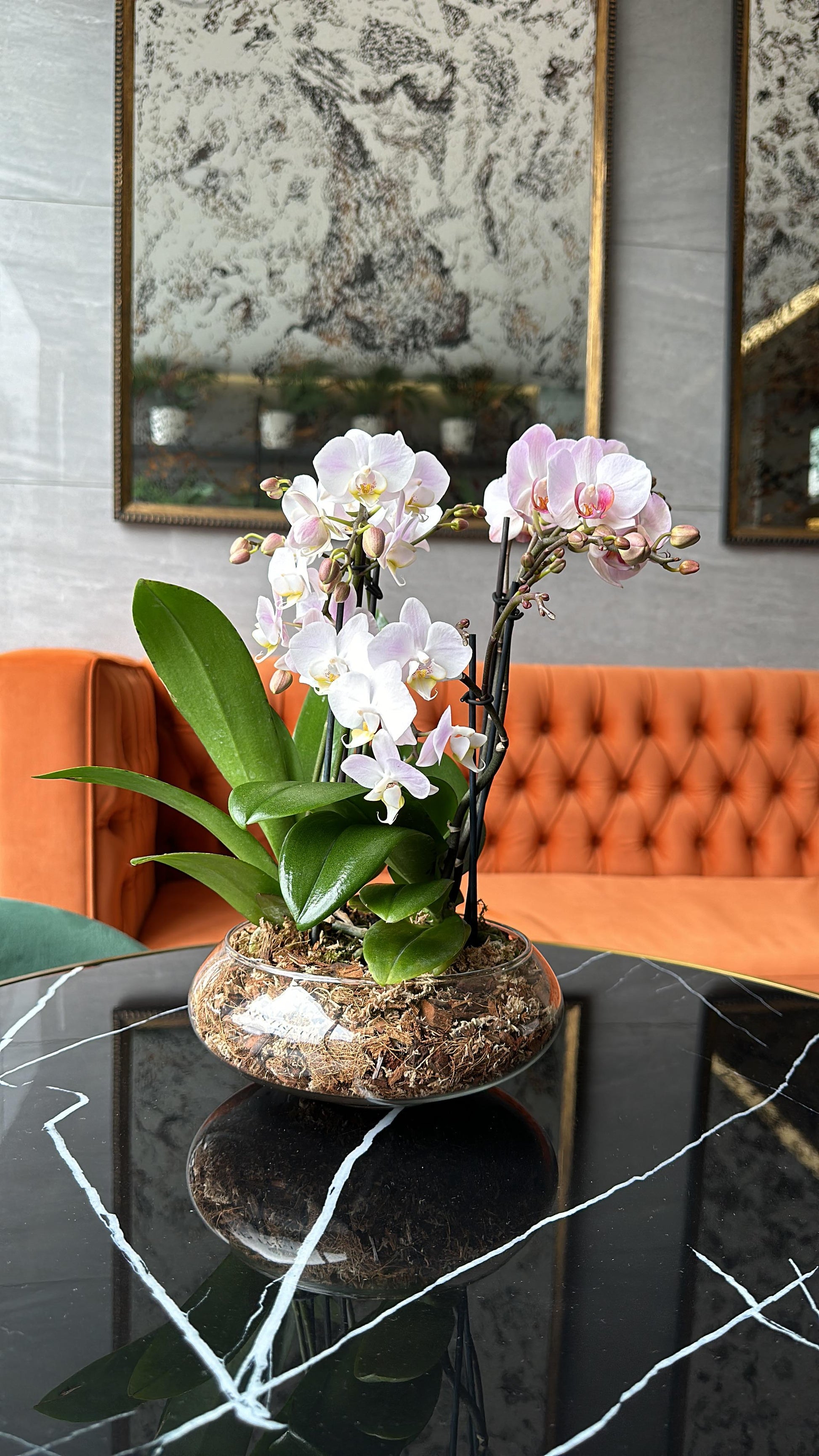 Se compone de dos plantas de orquídea Phalaenopsis variedad Multiflora, plantadas en sustrato específico para macetas sin drenaje, todo esto contenido en una hermosa base de vidrio estilo plafón ovalado.